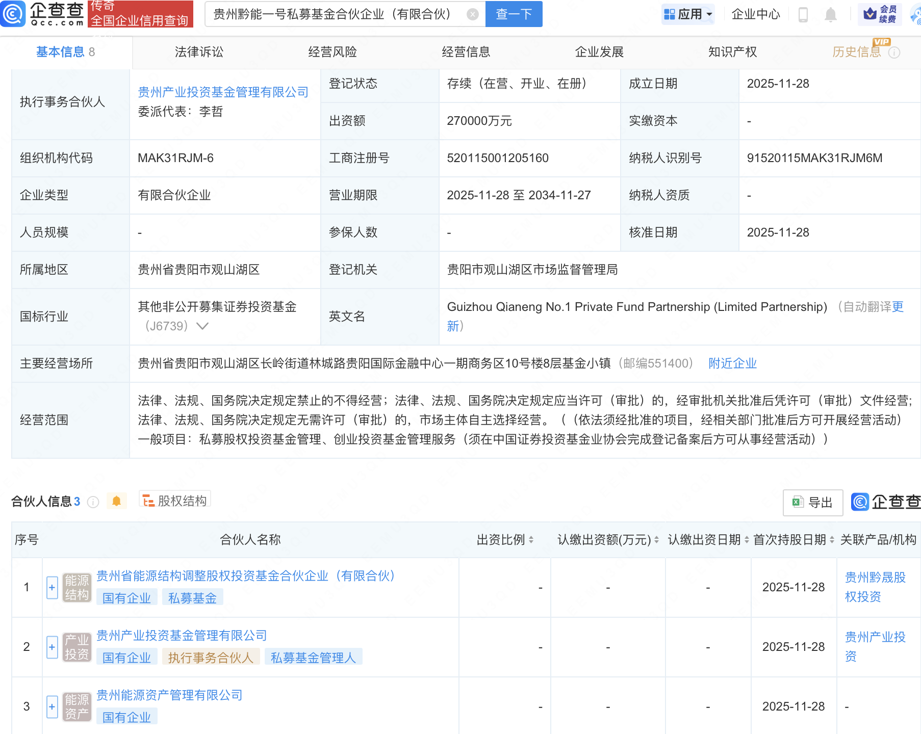 近日短期股票配资门户,贵州黔能一号私募基金合伙企业(有限合伙)成立,出资额27亿元,经营范围包含:私募股权投资基金管理、创业投资基金管理服务。企查查股权穿透显示,该企业由贵州省能源结构调整股权投资基金合伙企业(有限合伙)、贵州产业投资基金管理有限公司等共同出资。