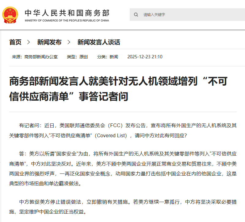 答:美方以所谓“国家安全”为由,将所有外国生产的无人机系统及其关键零部件等列入“不可信供应商清单”,中方对此坚决反对。近年来,美方不顾中美两国企业开展正常商业交易和贸易往来,不顾中美两国业界的强烈呼声,一再泛化国家安全概念,动用国家力量打击包括中国企业在内的他国企业,这是典型的市场扭曲和单边霸凌做法。
